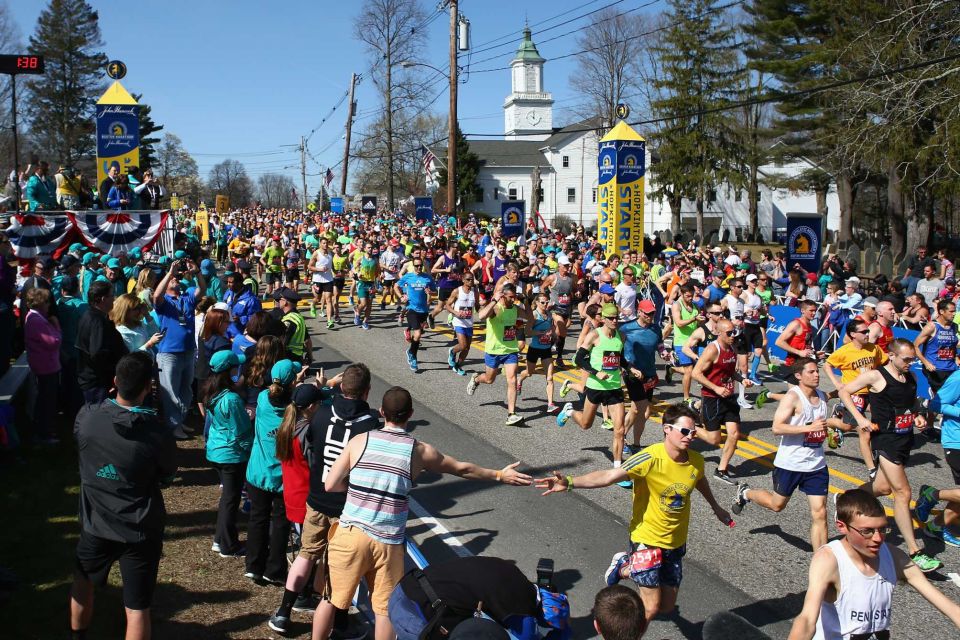 Die Stimmung ist bereits auf den ersten Metern riesig. Von Kilometer 1 bis ins Ziel wird man von hunderttausenden Menschen, die oft in Dreierreihen hintereinander am Streckenrand stehen, begeistert angefeuert. Da übersieht man dann schon mal nach ca. 2Kilometern den Hinweis auf die historische Startlinie in Ashland. Die ersten Marathonwettbewerbe Ende des 19., Anfang des 20. Jahrhunderts wurden noch über 25Meilen ausgetragen. Dies änderte sich erst mit den olympischen Spielen 1908 in London, die zur heute noch geltenden Länge von 26,2Meilen oder 42,195km führte.