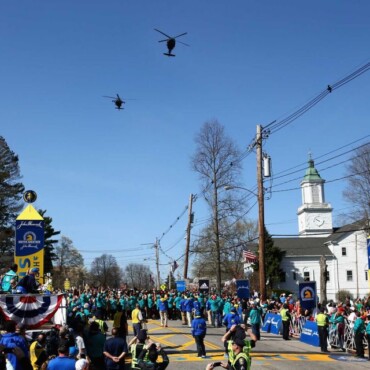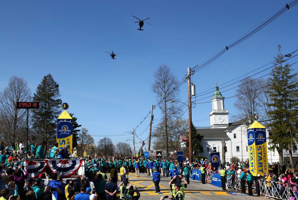 Die Sicherheitsbedingungen wurden nach dem Anschlag von 2013 nochmal verschärft – es durfte nur kleine Verpflegung, ausschließlich in durchsichtigen Plastikbeuteln mit zum Start genommen werden. Alles was wir mit zum Start nahmen blieb auch dort und wurde nicht zurück transportiert. Die wärmenden Sachen, die wir vor dem Start anhatten wurden Wohltätigkeitsvereinen übergeben. Die Kontrollen liefen freundlich und ohne große Stau’s ab, über dem Athletendorf in Hopkinton kreisten Hubschrauber, auf den Häusern (auch entlang der Laufstrecke) standen Scharfschützen. Die Polizei war überall präsent, vermittelte aber ein Gefühl der Sicherheit und war auf ihre Art sehr locker drauf, „… wir sind nur da, damit ihr lachend laufen könnt“ war die Ansage.