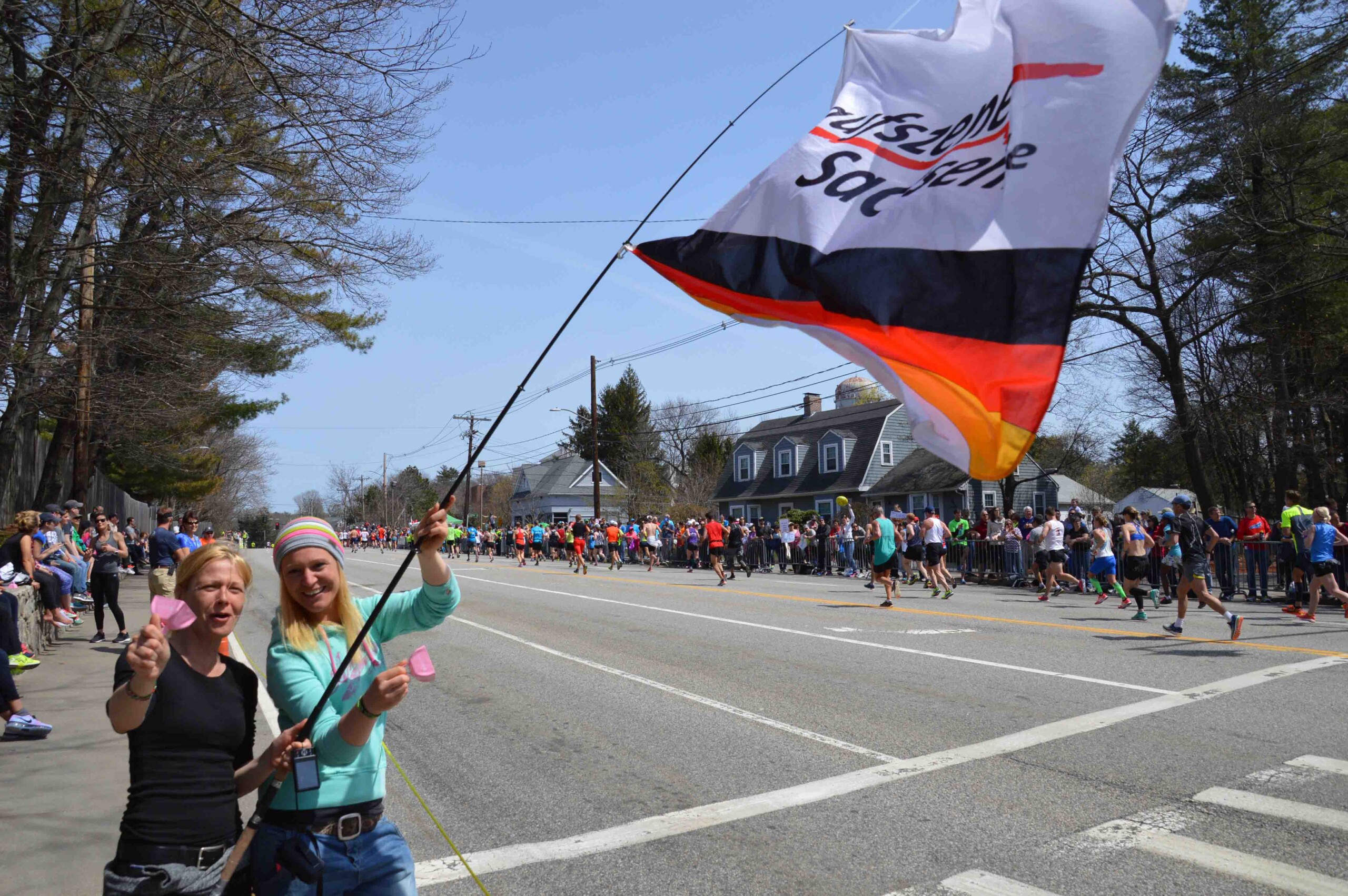 Dann, bei Km20, höre ich ein leises Sirren in der Ferne, das immer mehr zu einer Geräuschkulisse, ähnlich in einem Fußballstadion, wenn 70000 Fans bei einem Torschuss jubeln, wird – nur eine Oktave höher!!! – dann geht es ganz schnell und auf einmal sind sie da, Hunderte 14 bis 18-jährigen Mädels vom Wellesley College, wild gestikulierend und sich hemmungslos der kollektiven Massenhysterie hingebend. Gesichter sind kaum auszumachen, ein einziger schriller, durchdringender Dauerton erfüllt die Luft. Ich laufe am rechten Straßenrand, da wo der Jubel am größten ist und hab keine Chance die entgegengestreckten Hände nicht abzuklatschen. Küsschen werden verteilt und der Wunsch nach Kindern von den Läufern geäußert 🙂 Jeder, wirklich jeder Läufer nimmt ein Lächeln und ein leicht taubes Gefühl im Ohr von diesem besonderen Highlight der Strecke mit.