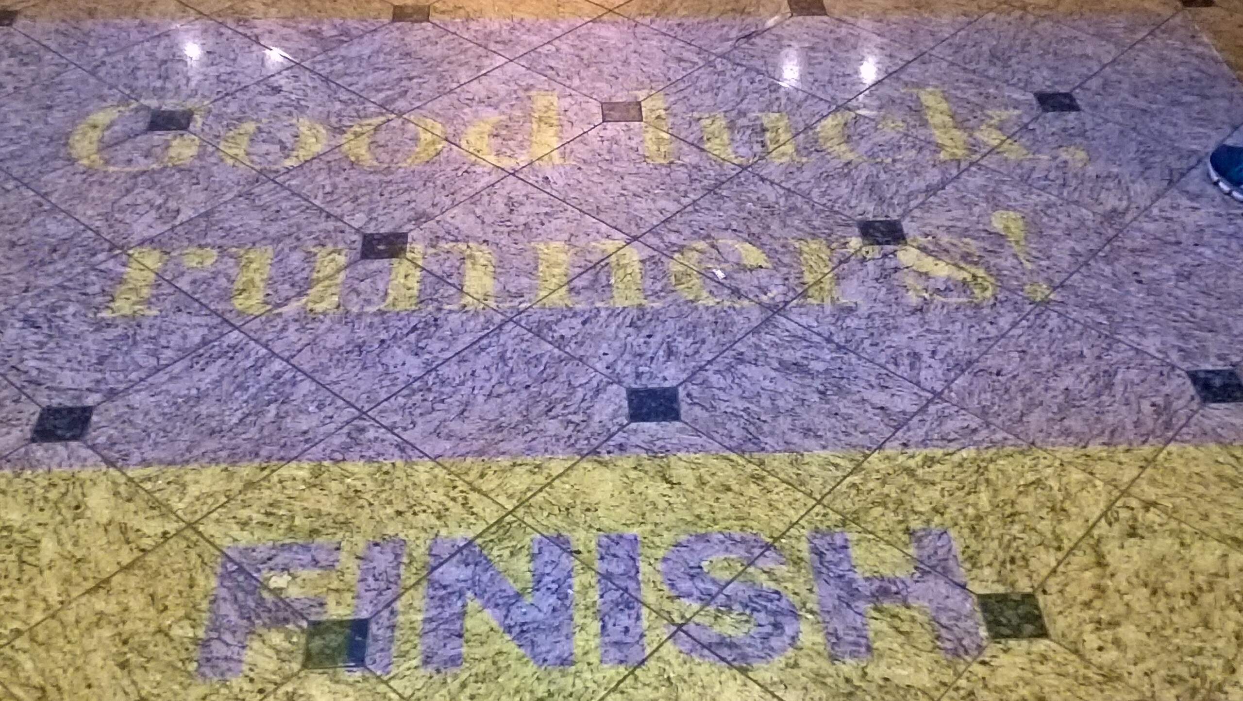 Der Lärmpegel wird nochmal stärker, es empfängt uns ein Zuschauermeer und diese letzten 600m muss ich einfach gehen und bewußt wahrnehmen. Die dichten Menschentrauben lassen zwischen den Häusern und der Laufstrecke keinen Platz mehr. Vorbei an einer Stafette wehender Fahnen gehe ich über die roten Matten der Zeitmessgeräte und die breite blaue Bodenmarkierung mit dem Wort…