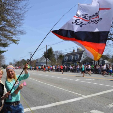 Es geht weiter bergab, runter in die Senke des Charles River, der auch durch Boston fließt. Jetzt kommen die Newton Hills, vier Anstiege auf den nächsten fünf Meilen, von denen jeder zwar nur etwa 40 Höhenmeter hat, aber beständig bergauf führt. Unser Reiseveranstalter Interair wartet bei Kilometer 27 mit einem Sonderservice für uns in Form von Bananen und Fotoshooting.